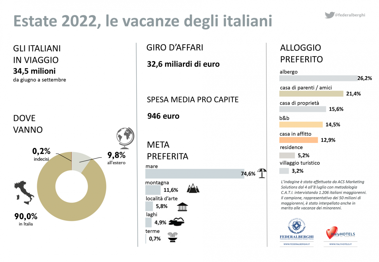 “Siamo di fronte ad una ripartenza forte, oserei dire violenta” afferma il presidente di Federalberghi Bernabò Bocca, a commento dei risultati dell’indagine previsionale sul movimento turistico degli italiani per questa estate 2022, realizzata con il supporto di ACS Marketing Solutions.